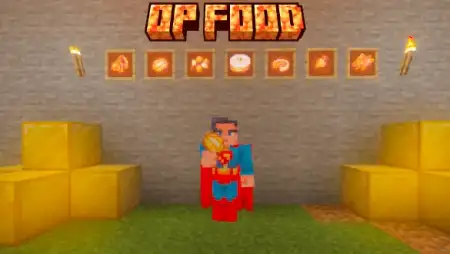 OP FOOD mod — a Minecraft Bedrock add-on that drops eight new golden foods into survival, each giving short, punchy potion-style effects for smarter pushes, PvP scrambles, and clutch escapes.