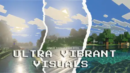 Ultra Vibrant Visuals for Vibrant Visuals — a Minecraft Bedrock visuals pack that layers a fresh cubemap subpack, new tonemap, tuned shadow midtones, cleaner water color, default PBR textures, updated atmosphere and night hues, a revised sun path, and fixed biome colors over the classic Vibrant look.