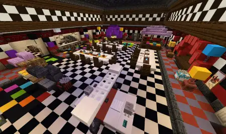 FNaF 1 Pizzeria [Game Based] Hide and Seek Map puts you and the crew inside a familiar restaurant after hours and lets the layout do the work. You call seeker, count in the office, and the lights and long corridors immediately start playing mind games. The dining room gives you bold, risky hides behind tables and party props. The side halls are pure tension—narrow enough to force shoulder-to-shoulder passes, long enough that a single footstep sends someone into a panic jog. Back rooms are where smart players win: tuck into a corner, listen, and slip out the moment the seeker overshoots.