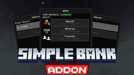 Simple Bank Mod — a Minecraft Bedrock add-on that adds a clean banking UI for deposits, withdrawals, and player-to-player transfers, plus an automated 1%–2.5% interest bonus every 12 hours on balances over $1,000,000.