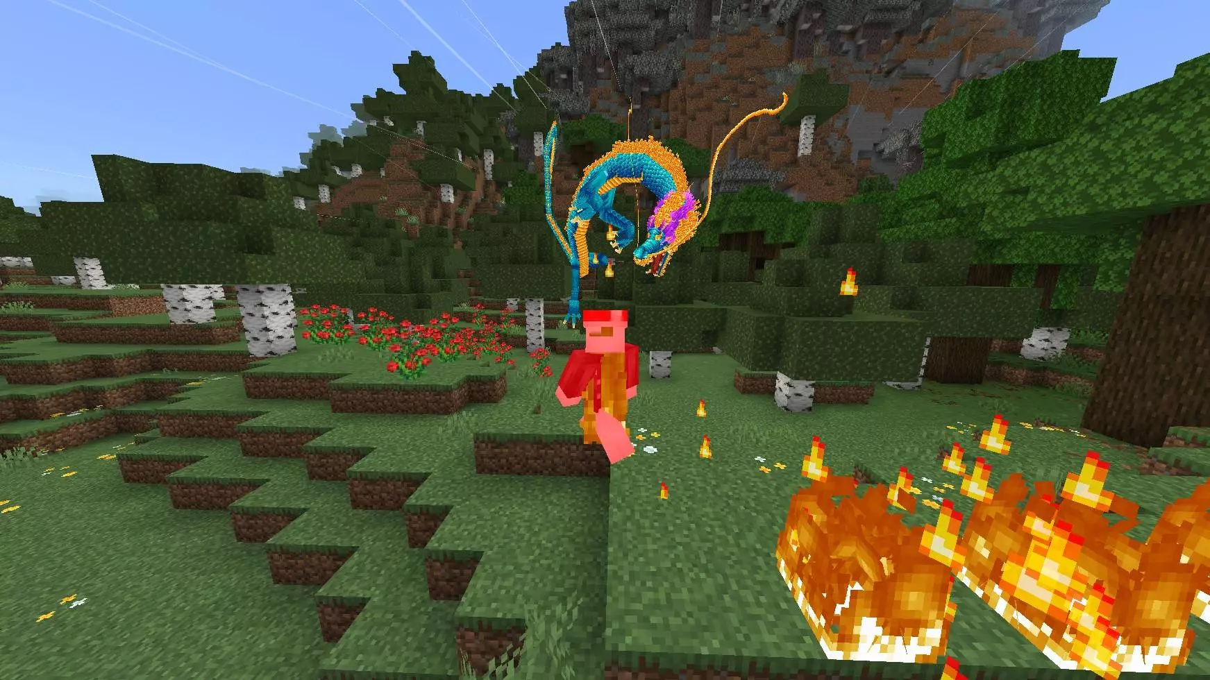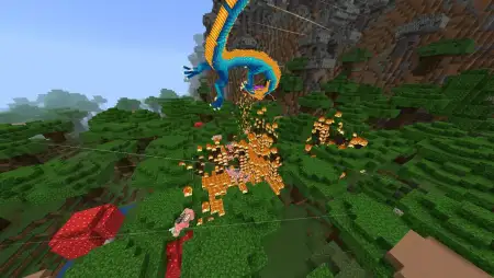 Dragon Festival Mod is a straight-up boss brawl for Minecraft Bedrock: the Vietnam Dragon (Panthenius type) packs 280 HP and a move set that forces you to learn patterns, manage space, and punish openings. Its core loop is simple—bait the cast, dodge clean, answer with damage—but the kit keeps you honest. Inferno Stream is the constant—sustained fire breath that burns down frontliners who face-tank too long. Flame Burst flips the table with a massive firewave that travels well over a hundred blocks and strips every status effect in range, so don’t bank your whole plan on potions while you’re hugging the boss. Chasing Fireball locks on and sticks to your pathing; break line of sight or snap it into cover before you go back to DPS.