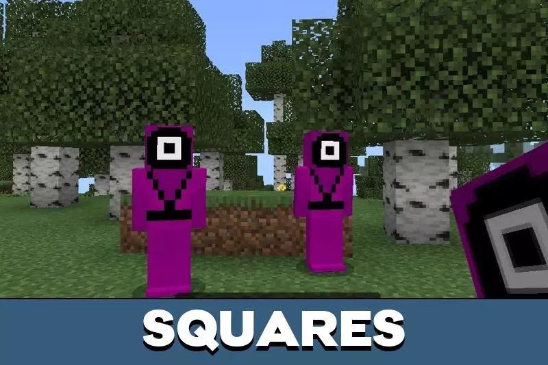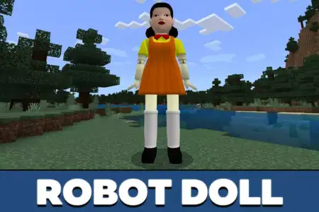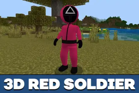 Squid Game Mod — a straight shot of chaos for Minecraft Bedrock where the series’ enforcers and set pieces crash your survival run. You gear up in the green overalls like the rules demand, the game starts, and the robot doll immediately goes hostile. She storms your position, lobs fire, and turns any open field into a kill zone while that famous tree looms over the arena. Meanwhile red fighters sweep the area and 3D soldiers with unique models hunt you down on sight. It’s loud, messy, and way more intense than a normal night in Bedrock.