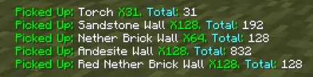 Out in the Nether, it keeps quartz and gold runs honest, and on End trips it’s perfect for tracking chorus fruit, rods, or random loot without losing momentum. Building feels smoother too. You farm wood or stone, watch the feed confirm numbers, and head right back to placing without the constant menu dance. There’s nothing to learn and nothing to babysit—just a clean little list that appears when you need it and stays out of the way when you don’t.
