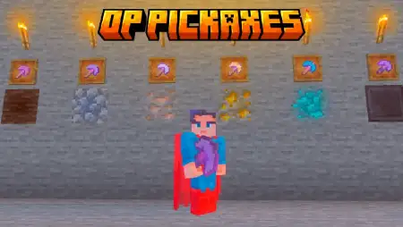 OP PICKAXES mod — a straight power lift for Minecraft Bedrock mining that still feels legit. You swing once, a tidy 3×3 chunk disappears, and suddenly branch mining, quarrying, and tunnel carving stop being chores and start feeling like you’re running a compact drill rig. I ran it on a fresh world and the pace change is wild: deepslate doesn’t slow you down, strip mines become actual hallways, and stronghold renovations go from weekend projects to one good session.