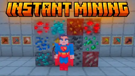 INSTANT MINING mod — tap one ore, watch the entire vein pop, and keep moving. This addon for Minecraft Bedrock swaps the slow “chip-chip-chip” loop for a clean, surgical vein clear the second you break a block with the Instant Mining tool. Coal, iron, copper, gold, redstone, lapis, diamond, emerald, nether quartz—if the blocks are connected and the same type, the addon chains through the vein and showers you with drops (right into your inventory if there’s space). It’s survival-friendly and multiplayer-safe, so you can run it on a fresh world or toss it on your realm when the crew is sick of strip-mining.