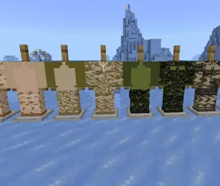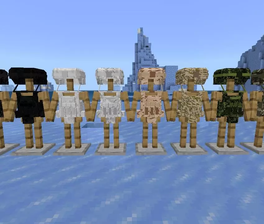 In practice, the armor is the star. Throw it on for village raids, patrols around a new outpost, or long overland hauls where creepers and skeletons keep testing your angles. The silhouettes stay readable in motion, so teammates can call positions fast—“green at the gate, tan on the ridge”—and screenshots don’t turn into noisy blobs. On co-op nights, it’s easy to theme roles: one player runs recon colors for scouting paths, another goes heavier for base defense, and the builder keeps a lighter set for scaffolds and quick repairs.