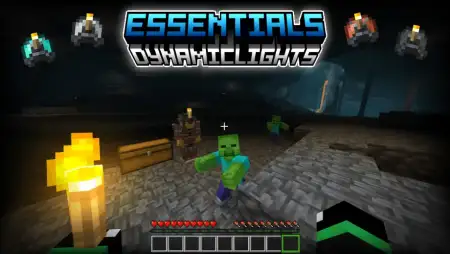 [Essentials] Dynamic Lights Mod lets your light actually move with you. Hold a torch, lantern, glowstone, or any of 35+ supported vanilla items and the cave around you brightens on the spot—no spam-placing torches just to see three steps ahead. Mobs can glow too: blazes, glow squids, allays, and even anything that’s currently on fire will cast light, so travel reads naturally as you push through the dark. It slots cleanly into Bedrock packs; the author built it to play nice alongside other add-ons and textures rather than fight them.