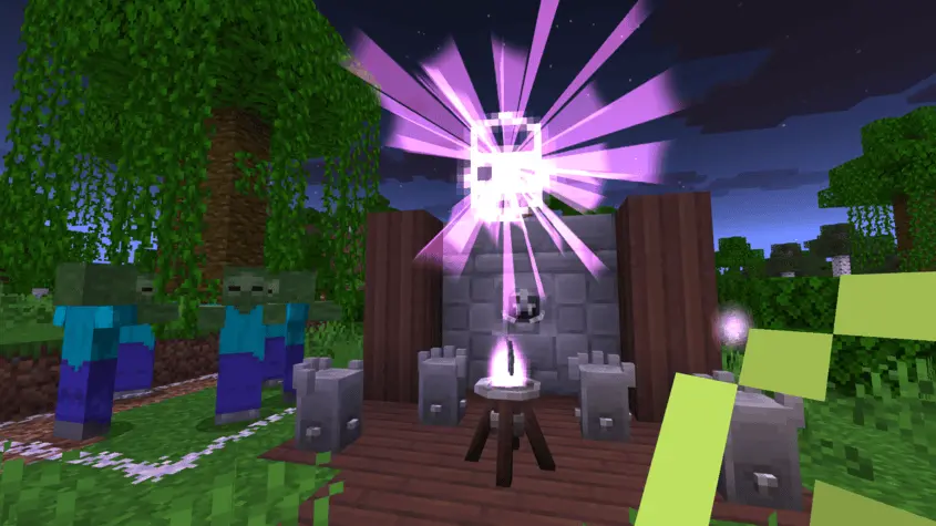 The cadence feels natural. Morning, you stock your bench with common materials and assemble a few arcane components alongside the usual picks and food. Afternoon, you test loadouts: a light offensive spell for stray mobs, a mobility trick for cliffs, a support cast that keeps you upright when a fight gets loud. By dusk you’re back at the base, setting the new blocks where they make sense—near furnaces, beside storage—so your next trip is tighter and faster. Mobs tied to the mod bring pressure that reads fair: they ask you to use the tools you just learned instead of face-tanking with brute gear.