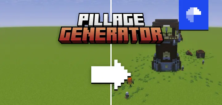 Pillage Generator Mod — a Minecraft Bedrock tool that lets you drop a full pillager outpost with one command or place individual pieces (logs, cage, tent, targets) to custom-build your own and bring superflat worlds to life.