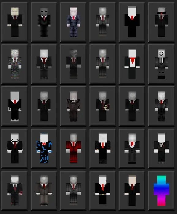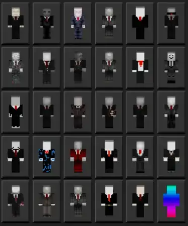 Slenderman Skinpack (30+ Skins) — a gallery of tall, unsettling silhouettes built for stalking trails at midnight in Minecraft Bedrock. You’re getting a whole roster of Slender-styled fits: razor-clean suits, stretched proportions, and color passes that lean cold—ghostly blues, bruised purples, and venom-green accents. Drop one on and you instantly read from across the map as “the thing in the treeline,” which is exactly the point.